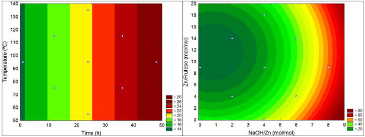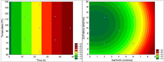 Under the same magnification, Figures 1a and 1c show the difference in the amount of solid deposited in samples 17 (5% degradation achieved) and 22 (25% degradation achieved), respectively. At higher magnifications, Figures 1b and 1c, different morphologies of the samples can be observed. For experimental condition 17, there are small agglomerates of spheres composed by rods, whereas experiment 22 presents a larger amount of irregular formations. When comparing the photocatalytic activity of the above-mentioned samples, an increase in the amount of solid and the rod structures can be associated with higher RhB degradation. Zinc plates results By analyzing the zinc plates results obtained by Statistica software using ANOVA, a relatively low correlation coefficient of around 0.8 was observed, indicating that the model is not predictive of the experimental data, and a pure error of 12 was obtained. The analysis indicated no interactions between the variables, and the most significant variable was the molar ratio NaOH / Zn, since it presents significant quadratic and linear coefficients. However, in Figure 2, the contour plots of the results for the zinc substrate indicated a tendency in the behavior of the variables. As the observation indicates, the higher the NaOH/Zn molar ratio the higher the dye degradation. This was the same behavior presented by the fructose. As the Zn/fructose molar ratio decreases, meaning an increase in the fructose concentration in the system, the degradation increases.