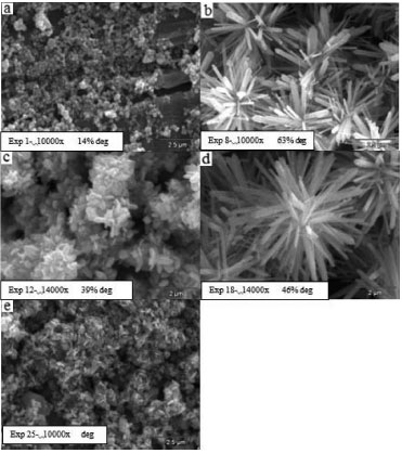 The copper plates, as well as the zinc plates, presented the formation of different morphologies and good film stability. The micrographs relating to the samples immobilized on copper sheets can be seen in Figure 5. The samples in Figure 5b and 5d are composed of many flower-like structures, formed by nanorods. These nanorods with micro-scale length and nano-scale diameter grow radially outward from the center of the flower. Although the sizes of these nanorods are different, they have a similar appearance, with a sharp tip directing away from the flower.
