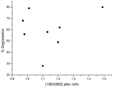 In an attempt to correlate the prevalence of the polar planes to the photocatalytic activity of the sample, we constructed the chart in Figure 7. From the data obtained, no correlation between (002) preferential growth and enhanced photocatalytic activity was observed.