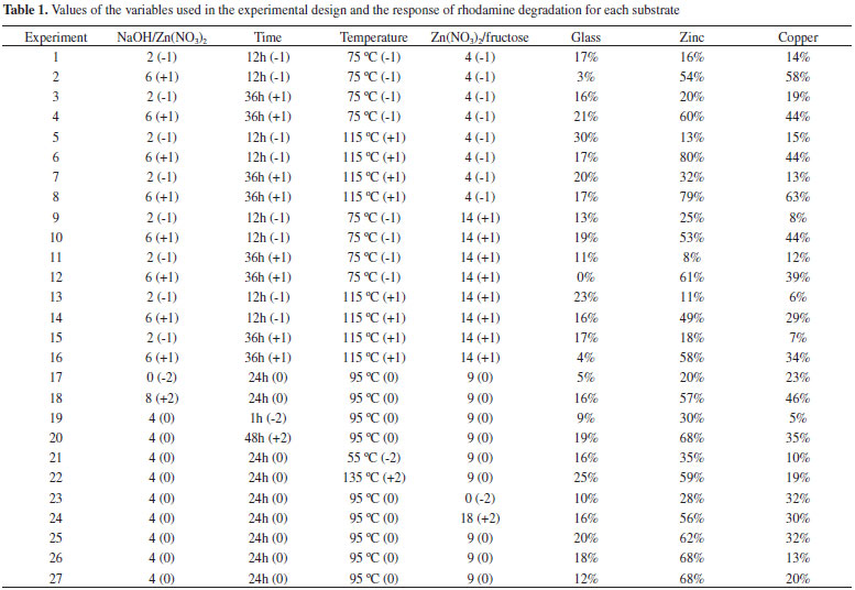 CONCLUSIONS A circumscribed central composite experimental design was used for evaluation of the synthesis variables in the preparation of ZnO immobilized on three different substrates. Among the substrates tested, zinc plates showed better film adhesion, the highest photocatalytic activity for rhodamine B degradation and better representation of the statistical model, whereas glass showed the worst results. For the zinc and copper substrates, the most important variable was the NaOH/Zn molar ratio, achieving higher values of degradation with higher values of NaOH/Zn. In the case of the zinc substrate, time and temperature showed linear and quadratic coefficients, whereas for the copper substrate, only the temperature showed quadratic coefficient. The SEM images of the ZnO immobilized on zinc foils showed a shorter and wider formation of rods when compared to copper substrate. The morphology of the samples provides valuable information. While perfectly ordered hexagonal structures are very important for photocatalytic activity, the best results were derived from the samples that contained a combination of ordered and disordered structures, indicating a synergic effect. By analyzing the powder at the bottom of the autoclaves, wurtzite structure formation can be observed.