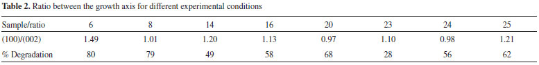 Samples 8 and 16 were both synthesized at a NaOH/Zn molar ratio of 6, a synthesis time of 36 hours and a temperature of 115 ºC, differing only in the fructose/Zn molar ratio (4 for experiment 8 and 14 for experiment 16). When the diffractograms of these samples were compared, the intensity of the crystalline peaks presented a significant difference. Under these experimental conditions, fructose may act by inhibiting the formation of the wurtzite crystalline phase in experiment 8, which has a higher concentration of fructose and presents less intense peaks in comparison to experiment 16. Regarding the synthesis time, we observed the formation of peaks attributed to crystalline wurtzite phase even within short periods of time, such as 3 hours (data not shown). The wurtzite ZnO lacks an inversion plane perpendicular to the c-axis, in which Zn2+ and O2- ion pile-up alternatively resulting in the polarized planes (001) and (00), respectively. The {100} planes are composed of equivalent positive and negative charges at the same plane; therefore they are nonpolar planes with lowest surface energy. In establishing a relation between planes (100) and (002), as shown in Table 2, samples 20 and 24 exhibited preferential growth along the c-axis plane (002), all the other samples demonstrated a preferred orientation towards plane (100).