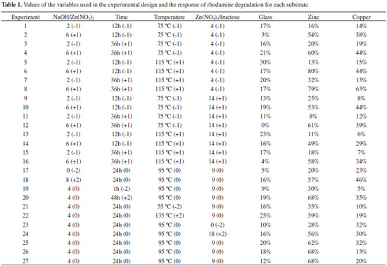 EXPERIMENTAL Materials All reagents were of analytical grade and used as purchased. Zinc nitrite Zn(NO3)2.6H2O and D-fructose used were from Synth with a purity of 98%, NaOH was from Nuclear with a purity of 97% and the Ethanol, 2-propanol and acetone were from Dinâmica. Preparation of ZnO immobilized structures The route for the synthesis of the ZnO immobilized was adapted from Ma et al.6 The substrates (etched glass, zinc and copper foils, 2.5 × 2.5 cm) were previously ultrasonically cleaned in a succession of acetone, ethanol and 2-propanol. To obtain ZnO immobilized on different substrates, a suspension of Zn(NO3)2.6H2O 0.5 mol L-1 and NaOH (from 0 to 4 mol L-1) was initially prepared and stirred for five minutes. D-fructose was then added and stirred for thirty minutes (concentration from 0 to 0.25 mol L-1). The suspension was transferred into Teflon-lined autoclaves with the substrate inclined at the bottom. The samples were submitted to hydrothermal treatment for 1 to 48 hours at 55-115 ºC. At the end of the reaction, the plates with the semiconductor were washed with deionized water and dried at 60 ºC overnight. Photocatalytic activity evaluation Photocatalytic activity of the ZnO products was evaluated by decomposition of rhodamine B (RhB) under UV radiation. First, the plates with immobilized ZnO were immersed in 40 mL of RhB solution 10 mg L-1, and maintained in the dark for one hour to establish the adsorption equilibrium. Next, the system was irradiated with a 125 W medium-pressure mercury lamp for 60 minutes. The irradiation from the lamp was measured and adjusted to approximately 3.5 mW cm-2 (λ = 365 nm) at the beginning of each trial using a radiometer (Cole-Parmer Instrument, Series 9811 Radiometer). The system temperature was kept constant at 30 ºC. The dye absorption was determined with a UV/Vis spectrophotometer at λ = 553 nm. Design of experiments For each substrate, a circumscribed central composite experimental design (CCD) was used to evaluate the variables, NaOH/Zn(NO3)2 molar ratio, time, temperature and Zn(NO3)2/fructose molar ratio. This model consists of a factorial design with 2n (n = 4) experiments, 8 star points and 3 central points, resulting in a total of 27 experiments for each substrate. The data were analyzed using Statistica 8 software, which provided the polynomial associated with the photocatalytic reaction system and the response surfaces. The model was statistically validated with the same software using ANOVA (confidence interval 90%). Sample characterization The morphology of the products was analyzed by Scan Electron Microscopy (SEM) using a JOEL JSM 5800 microscope. The crystal structure of the ZnO was determined by X-ray diffraction (XRD) on the residual solid at the bottom of the autoclaves, using a Bruker diffractometer with CuKα radiation.