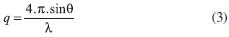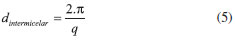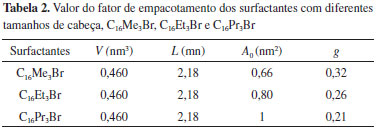 Segundo Lin et al.9 e Sastry et al.,19 o aumento da desorganização com o tamanho da cabeça do surfactante é decorrente de impedimentos estéricos durante a micelização, promovendo uma menor condensação de ânions brometo ao redor das micelas dos surfactantes C16Et3Br e C16Pr3Br. De acordo com Mukerjee et al.,20 a menor condensação dos ânions brometo ao redor das micelas dos surfactantes C16Et3Br e C16Pr3Br está relacionado com o menor número de moléculas desses surfactantes presentes nas micelas, comparado às micelas do surfactante C16Me3Br. Como observado na Tabela 1, alterações na área da cabeça catiônica dos surfactantes com cauda cetila ocasionam mudanças no fator de empacotamento e na organização micelar (Figura 1). Assim sendo, seria interessante estimar o valor do fator de empacotamento g para os surfactantes utilizados neste trabalho e sua possível influência na estrutura das sílicas formadas. A estimativa de g foi realizada aplicando-se o cálculo do volume V e do comprimento l da cauda hidrofóbica (Equações 9 e 10)21 na Equação 1. Nestas equações, n(CH3) e m(CH2) representam o número de grupos metila e metileno, respectivamente, da cauda do surfactante. ![]() ![]() Os valores de A0 usados na Equação 1 foram estimados por Warr et al.22 Os resultados dos valores de g para alguns dos surfactantes utilizados nesse estudo estão apresentados na Tabela 2.
