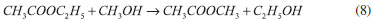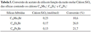 Avaliação catalítica das sílicas híbridas Kubota et al.26 encontraram que a sílica MCM-41 contendo o cátion C16Me3+ em seus poros apresentou elevada atividade catalítica na condensação de Knoevenagel. Segundo esses autores, a atividade da MCM-41 híbrida é decorrente da basicidade dos ânions silóxi (≡SiO-) associados aos cátions C16Me3+. Esses resultados foram confirmados por Martins et al.27 através da Ressonância Magnética Nuclear de 29Si (CP-29Si-MAS-RMN) e Espectroscopia de Fotoelétrons estimulados por Raios X (O1s XPS). Sendo assim, as sílicas sintetizadas com os surfactantes com cauda cetila e diferentes tamanhos de cabeça foram avaliadas cataliticamente na reação modelo de transesterificação (Equação 8). A Tabela 5 apresenta os resultados de conversão de acetato de etila em função da razão molar Cátion:SiO2 das sílicas contendo os cátions C16Me3+, C16Et3+ e C16Pr3+. A razão molar Cátion:SiO2 foi estimada a partir dos resultados da perda de massa do cátion orgânico apresentados na última coluna da Tabela 4.