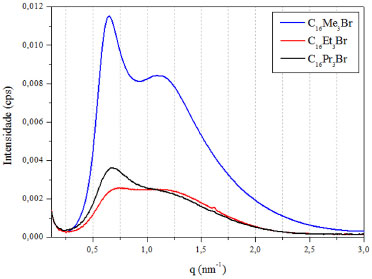 ![]() Figura 1. Curvas de SAXS das dispersões aquosas das micelas dos surfactantes com diferentes tamanhos de cabeça, C16Me3Br, C16Et3Br e C16Pr3Br (concentração de surfactante de 0.16 mol L-1)