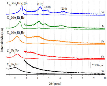 ![]() Figura 2. Difratogramas de raios X das sílicas sintetizadas a partir de surfactantes com cauda cetila e diferentes tamanhos de cabeça