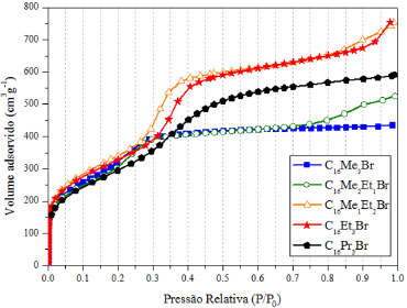 ![]() Figura 3. Isotermas de fisissorção de nitrogênio das sílicas calcinadas preparadas a partir de surfactantes com cauda cetila e diferentes tamanhos de cabeça