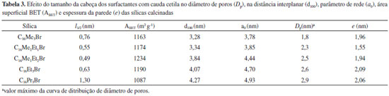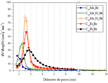 A partir das isotermas de adsorção de N2 foram calculadas as curvas de distribuição do diâmetro de poros das sílicas, representadas pela Figura 4. Observa-se, em todos os casos, uma distribuição unimodal, com máximos localizados entre 1,5 e 3,0 nm. Além disso, verifica-se um deslocamento dos máximos das curvas de distribuição para diâmetros de poros maiores em função do emprego de surfactantes com maior tamanho de cabeça, indicando a expansão dos diâmetros dos poros das sílicas. A Figura 4 mostra também que, com o aumento do tamanho da cabeça do surfactante, o valor da derivada passa por um máximo na sílica formada na presença surfactante C16Me1Et2Br. Isso é um indício de que, nesse mesmo sentido, a uniformidade do diâmetro dos poros passa por um máximo. Esse indício é confirmado pelo valor da largura à meia altura, l1/2, como pode-se observar na Tabela 3.