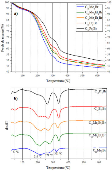 ![]() Figura 5. Termogramas (a) e curvas dm/dT (b) em atmosfera oxidante das sílicas sintetizadas com os surfactantes com cauda cetila e diferentes tamanhos de cabeça