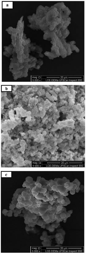 ![]() Figura 6. Micrografias das sílicas contendo os cátions (a) C16Me3+, (b) C16Et3+ e (c) C16Pr3+