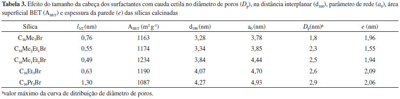 De acordo com Huo et al.,5 para surfactantes com cabeça contendo três grupos metila e diferentes comprimentos de cauda (CnMe3Br, n = 8-18), o valor da razão entre o volume e o comprimento da cauda hidrofóbica, V/l, praticamente não se altera com o aumento do comprimento da cauda hidrofóbica desse surfactante, uma vez que ambas as variáveis são diretamente dependentes do número de átomos de carbono (o valor dessa razão para a cabeça contendo o grupo trimetila é, em média A0 = 0,21 nm2). No entanto, quando o comprimento da cauda é superior a 20 átomos de carbono, ela pode se enrolar formando um helicoide e levando à diminuição do comprimento l, enquanto seu volume não muda significantemente. Sendo assim, tem-se um aumento no valor de g e a formação de micelas com menor curvatura, como é o caso dos surfactantes C20Me3Br e C22Me3Br que levaram à formação de fases mesoporosas lamelares, enquanto surfactantes alquiltrimetilamônio com comprimento de cauda igual ou inferior a 18 átomos de carbono favoreceram a formação da MCM-41.5 Posteriormente, Ryoo et al.10 demonstraram que há um aumento da ordenação estrutural da MCM-41 sintetizada com uma mistura de surfactantes com cabeça contendo três grupos metila (CnMe3Br) e etila (CnEt3Br) e com diferentes comprimentos de cauda (n = 12-22). Assim como Huo et al.,5 esses autores encontraram que o aumento da cauda hidrofóbica dos surfactantes com cabeça contendo três radicais metila favoreceu a formação de estruturas micelares com menor curvatura e a transição da formação de estruturas micelares cúbicas para estruturas micelares lamelares, sendo possível então a obtenção de uma sílica mesoporosa lamelar a partir do surfactante C22Me3Br. Já o emprego da mistura dos surfactantes com mesmo comprimento de cauda e diferentes tamanhos de cabeça C22Me3Br e C22Et3Br proporcionou novamente a formação da sílica mesoporosa hexagonal, MCM-41, o que sugere que a utilização de razões ótimas entre os surfactantes alquiltrimetilamônio e alquiltrietilamônio representa uma eficaz maneira de controlar a curvatura da superfície micelar e a formação das diferentes fases mesoporosas. Este trabalho tem como objetivo verificar a influência, na síntese de sílicas mesoporosas, de surfactantes contendo uma cauda com número fixo de átomos de carbono (C16) e diferentes tamanhos de cabeça hidrofílica.