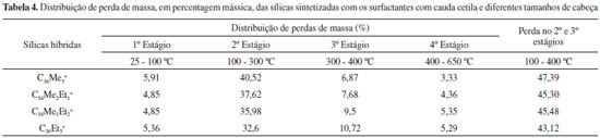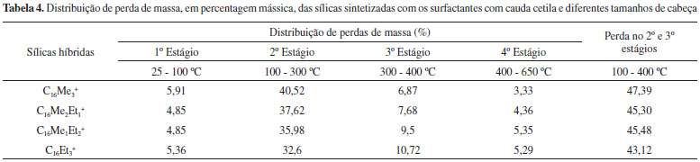 De acordo com esses autores,24 a primeira etapa de decomposição do cátion C16Me3+ (etapa II) da MCM-41 é endotérmica e consiste na eliminação dos grupos da cabeça do surfactante, ou seja, a formação da trimetilamina (N+(CH3)3) e de hidrocarbonetos. Estes resultados foram confirmados por Keene et al.,25 identificando que o principal hidrocarboneto é o hexadeceno, formado via degradação de Hoffmann (216 ºC). Ainda dentro da etapa II, Kleitz et al.24 identificaram ainda a presença de hidrocarbonetos menores, decorrentes da fragmentação do hexadeceno (270 ºC). A próxima etapa de decomposição do cátion C16Me3+, (etapa III) corresponde à oxidação dos compostos orgânicos (320 ºC) nos mesoporos recém-formados da sílica, levando à formação de dióxido de carbono, água, entre outras. A partir da Figura 5 foi calculada a distribuição de perda de massa (em percentagem mássica), cujos resultados são apresentados na Tabela 4. Pode-se observar que quanto menor a cabeça dos surfactantes com cauda cetila, maior a perda de massa referente à decomposição do cátion orgânico. Ou seja, quanto menor o tamanho da cabeça dos surfactantes com cauda cetila, maior a razão Cátion:SiO2.