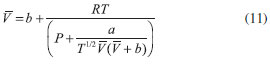 EQUAÇÃO DE ESTADO DE REDLICH-KWONG A equação (6) pode ser utilizada para qualquer equação de estado cúbica. Embora a equação de van der Waals é histórica e amplamente discutida em livros de Físico-Química, não é muito acurada. É interessante utilizar uma equação de estado que reproduza bem os dados experimentais, pois isso leva a uma melhor apreciação da mesma. Por este motivo, escolheu-se utilizar a equação de Redlich-Kwong (8) para ilustrar a metodologia, por ser mais a acurada do que a equação de van der Waals, mas ainda ser uma equação cúbica relativamente simples.6-8 ![]() Os parâmetros a e b desta equação estão relacionados a temperatura e pressão crítica pelas equações (9) e (10): ![]() ![]() Utilizou-se o CO2 como exemplo, o qual tem os seguintes valores dos parâmetros da equação: a = 63,752 atm L2 mol-2 K1/2 e b = 0,029677 L/mol (valores da referência 5)