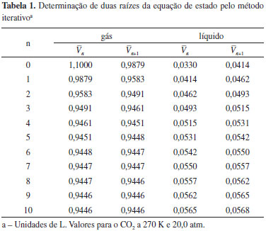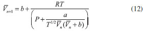 DETERMINAÇÃO DOS VOLUMES DAS FASES GASOSA E LÍQUIDA O leitor deve notar que não tem como sabermos a priori qual é a pressão correspondente ao equilíbrio líquido-vapor em uma isoterma, ou seja, a reta da Figura 1. Isso será feito em etapas, aplicando a regra das áreas de Maxwell. Mas o primeiro passo é determinar qual o volume das fases líquido e gás em uma isoterma, quando fixamos a pressão. Para este fim, utilizaremos o método iterativo. A abordagem consiste de reescrever a equação (8) na seguinte forma: ![]() No procedimento, introduzimos um valor inicial para o volume molar na equação (11), e obtemos o volume molar da primeira iteração, mais próximo da solução. Com este novo volume, repetimos novamente o procedimento e fazemos assim de forma sucessiva até o valor do volume convergir. Para ficar mais claro, podemos colocar a equação (11) na forma: ![]() ou seja, usamos um valor de