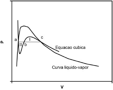 ![]() Figura 1. Comportamento de uma equação cúbica de estado, mostrando oscilação da função P( ) na região de condensação, sendo que a igualdade das áreas I e II determina os pontos que geram a curva de equilíbrio líquido-vapor