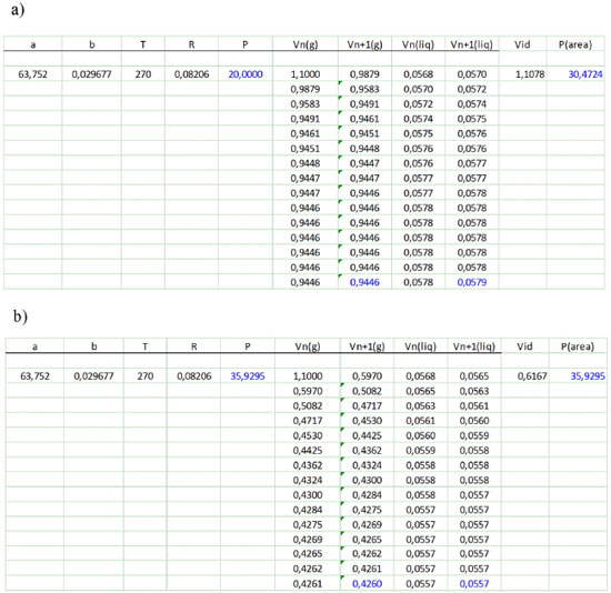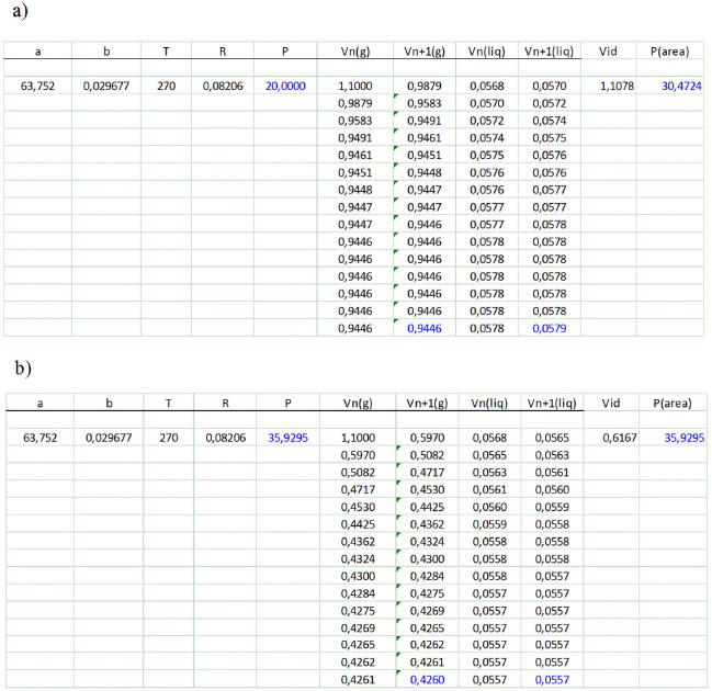 Figura 2. Operações na planilha: a) Valor inicial da pressão (P) e pressão obtida (P(área)). b) Convergência do processo iterativo. A temperatura de 270 K, a pressão de condensação é 35,9295 atm e os volumes molares obtidos são: fase gás a 0,4260 L e fase líquida 0,0557 L