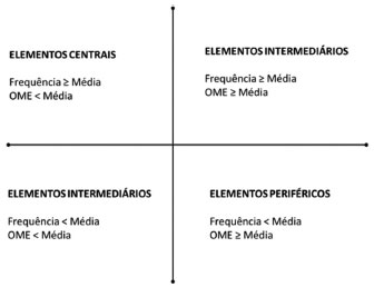 ![]() Figura 1. Critérios utilizados para definição dos elementos centrais, intermediários e periféricos a partir da evocação livre de palavras16