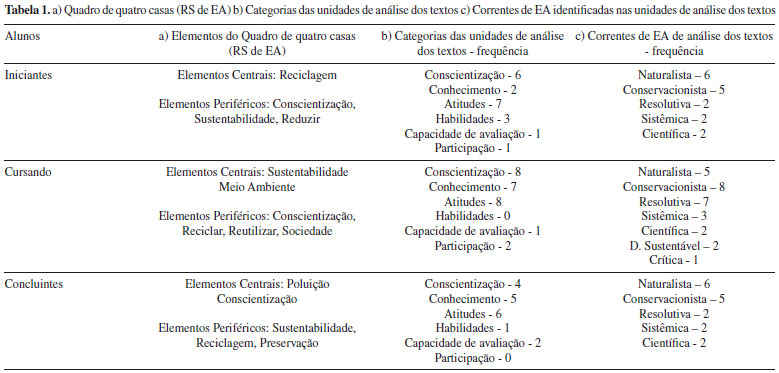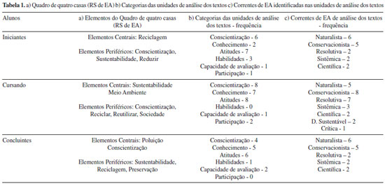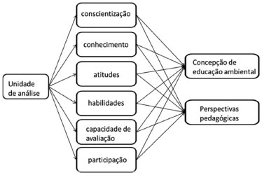 Estas dimensões de unidades de análise foram desenvolvidas com base nos objetivos da EA preconizados pela Carta de Belgrado. Diversos autores têm defendido uma articulação entre o aspecto cognitivo (conhecimentos), o subjetivo (sentimentos, princípios, consciência, ética) e a educação política (atitudes, habilidades, capacidade de avaliação, participação) para um trabalho efetivo de EA.21-24 Considerando que a EA exige duas dimensões para análise: a dimensão epistemológica e a dimensão pedagógica, foram atribuídas na categorização características tanto das concepções de EA quanto das perspectivas pedagógicas e metodológicas apontadas por Sauvé.4,25
