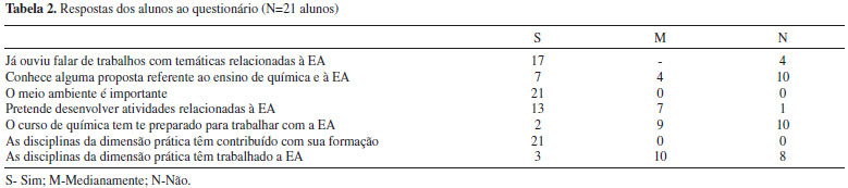 Através das respostas dos estudantes, todos os alunos consideram o meio ambiente importante por ser considerado como um recurso, apresentando uma relação de dependência e sobrevivência. Os trechos transcritos a seguir exemplificam a presença da concepção antropocêntrica entre os alunos que, segundo Reigota, evidencia a utilidade dos recursos naturais para a sobrevivência do ser humano.33 O homem é parte do meio ambiente e com este estabelece uma relação de dependência, é seu corpo inorgânico (Lítio). Porque é o local onde a humanidade extrai as condições de manter sua existência (Magnésio). As representações que identificam o meio ambiente como recurso para ser cuidado, gerido, repartido implicam uma EA para a conservação da natureza como um recurso de todos, no presente e no futuro, caracterizada pela corrente conservacionista.34 Porém, ao tentarem definir o que é meio ambiente, a centralidade incide em representações de meio ambiente apenas como recurso (62%). [...] é onde os seres humanos e os animais estão vivendo e dele tira seu sustento, moradia, etc. (Potássio). Os resultados obtidos sugerem ainda que sete alunos pretendem desenvolver atividades relacionadas à EA de maneira mais intensa (ex. Sódio), enquanto outros cinco alunos pretendem desenvolver essas atividades medianamente (ex. Potássio, Magnésio, Berílio). Pretendo trabalhar na perspectiva CTS, pois estou convicto que, como função de educador, tenho que, para além dos conteúdos, problematizar as questões relativas à sociedade. (Sódio) Problematizar uma prática social para transformar, conscientizar as ações dos agentes sociais, estudantes. (Rubídio) Preciso me apropriar de mais conhecimento nesta área. (Potássio) Me falta experiência no tema. (Magnésio) Vou tentar o máximo que conseguir encaixar no tempo. (Berílio) Acreditamos que a intenção de desenvolver atividades relacionadas à EA na prática docente depende do conhecimento profissional docente em relação à temática e intencionalidade para sua efetivação, o que implica reflexos da inserção da EA na formação inicial. Outra questão importante em relação a intencionalidade é considerarmos a subjetividade intrínseca do professor, o que Carvalho denomina de sujeito ecológico que designa um ideal ecológico, uma utopia pessoal e social norteadora das decisões e estilos de vida dos que adotam, em alguma medida, uma orientação ecológica em suas vidas.3 Os alunos consideram que os conteúdos químicos mais importantes para trabalhar a EA são reações químicas (4); química orgânica (5); funções inorgânicas (3); analítica (3); soluções (3) e gases (3), conforme podemos observar nos trechos a seguir. Poucos alunos justificam o porquê de considerarem importantes tais conteúdos. Reações químicas; dão suporte para o entendimento de como a matéria se transforma e sua implicação, como por exemplo, as reações de combustão que exacerbam o efeito estufa. (Sódio) Gases e reações químicas - pode ser interessante ao trabalhar com poluição. (Lítio) De maneira geral os orgânicos, por que a meu ver são os mais agressores. (Frâncio) A seleção dos conteúdos evidencia um importante aspecto do conhecimento do currículo e, a partir do aperfeiçoamento deste conhecimento, o futuro professor adquire condições de situar e de justificar a presença de determinado conteúdo dentro da estrutura curricular, tomando ciência da relação desse com os demais conteúdos curriculares.35 Na opinião de 10 alunos, o curso de química não os têm preparado de maneira adequada para trabalhar com a EA. A seguir a transcrição de alguns trechos dos textos dos alunos. Somente no final do curso de licenciatura estudei na disciplina ensino de química no contexto, que envolve o estudo das relações CTSA. (Cálcio) Somente em disciplinas que são optativas. (Gadolínio) A única associação que recordo é durante as aulas práticas onde citavam o descarte adequado dos resíduos, evitar o uso ou substituir reagentes tóxicos por outros menos agressivos e diminuir a geração de resíduos, neutralizar ácidos e bases antes de descartar. (Disprósio) Para outros 9 alunos a preparação é mediana, pelo fato da discussão ser realizada pontualmente na disciplina Ensino de Química no Contexto. A percepção que as disciplinas da dimensão prática têm contribuído com a formação do professor é presente entre todos os estudantes, como podemos observar nos trechos a seguir. Possibilitaram-me uma nova visão do que é o ensino, a aprendizagem, a educação. Mostraram a importância da historicidade nas questões não apenas educacionais, mas para se compreender todo o contexto em que se vive. (Lítio) Dando suporte para entender a realidade objetiva, possibilitando a atuação nas esferas sociais com o olhar crítico frente à sociedade e o entendimento do quão importante é o papel da educação. (Sódio) Nessas disciplinas discutimos vários aspectos importantes para a compreensão da lógica do conhecimento, além de trabalhar numa perspectiva mais geral do que é educação. (Ouro) A disciplina o professor e o ensino de química tem me ajudado a compreender "o homem como ser social", além de perceber a situação do ensino atual e os meios para melhorar a qualidade do ensino. (Térbio) Apenas 3 alunos consideram que essas disciplinas têm trabalhado a EA, para 8 alunos não contribui e para outros 10 contribui medianamente. Percebi o enfoque na Educação Ambiental, por parte da disciplina ensino de química no contexto. Nas demais, muito pouco se fala sobre o tema. (Césio) A Educação Ambiental não é discutida diretamente, mas é trabalhado o que há por trás dos problemas referentes à sociedade como um todo. (Sódio) Todas mostram de alguma forma a relação do homem com o meio ambiente. (Rubídio) Esses dados revelam uma carência de discussões explícitas de referenciais teóricos relativ
