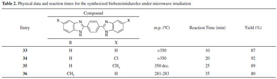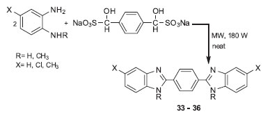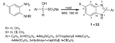 RESULTS AND DISCUSSION Aldehyde bisulfite adducts were easly prepared according to the conventional method as described in the experimental section. They are whitish solids that remain stable for a long time when stored in a refrigerator. The compounds, 2-substituted benzimidazoles (1-32) and bis-benzimidazoles (33-36) were synthesized via condensation of o-phenylenediamines with aldehyde bisulfite adducts under MW irradiation. MW reactions were performed under a neat protocol, using only a few drops of DMF to homogenize the reaction mixture. Eight aromatic aldehydes, a dialdehyde, and four o-phenylenediamines, including those bearing electron-donating or electron-withdrawing substituents, were used to investigate the efficiency of the method. The synthetic schemes for the synthesis of benzimidazoles and bisbenzimidazoles are described in Scheme 2 and Scheme 3, respectively.