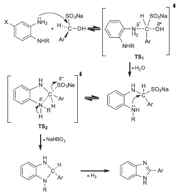 The developed protocol was specifically significant for the synthesis of bisbenzimidazoles. As indicated in the literature, their synthesis by conventional heating required prolonged reaction times32-34 and harsh conditions such as high temperatures,20 high pressures,20 and toxic solvents.33-35 In this study, the synthesis was performed in short times (e.g., 10 min for compound 33) with good yields (80-92%) under mild (MW/180 W) and solvent-free conditions. A mechanism have been proposed for the preperation of benzimidazoles based on some information in the literature27,36 (Scheme 4). The reaction begins with the nucleophilic attack of the amine group on the o-phenylenediamine to the carbon atom of aldehyde bisulfite adduct. One mole of water is eliminated. Subsequently, the resulting alkyl sulfonate further reacts with the other amine group of o-phenylenediamine, resulting in the formation of dihydroimidazole intermediate. Finally, aromatization gives benzimidazole nucleus. Dipolar transition state structures (TS1 and TS2) are formed in the course of the reaction. As indicated in the literature,29 this type of reactions are expected to proceed at a faster rate and provide high yields under MW irradiation.