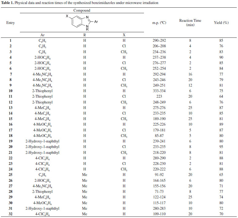 The current experimental results are summarized in Table 1 and Table 2. Benzimidazoles bearing either electron-donating (entries 4-9 and 13-18) or electron-withdrawing substituents (entries 22-24) were successfully produced in very short times with excellent yields. Considering the reaction times, a significant effect of the substituents on either aldehydes or o-phenylenediamines were not observed. A methyl substitution on nitrogen atom of o-phenylenediamine decreased the rate, possibly because of steric hindrance (entries 25-32). The reactions with N-methyl o-phenylenediamine were completed in longer times with lower yields compared with their unsubstituted analogues (entries 1, 4, 7, 10, 13, 16, 19, and 22).