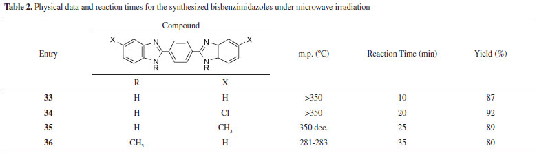 To compare the MW-assisted synthesis method with the classical heating method, the synthesis of some benzimidazoles were also performed under reflux in DMF. Related experimental results are shown in Table 3. It is clear that in all cases much shorter reaction times and higher yields were achieved under MW irradiation compared with classical heating. For example, with conventional heating, 2-(5-chlorobenzimidazolyl)phenol 5 was obtained in 45% yield in 120 min; under MW conditions, after 2 min the yield of the reaction was 85%. Similarly, classical and MW-assisted sysnthesis yielded 2-(5-chlorophenyl)benzimidazole 22 in 43% (180 min) and 77% (2 min), respectively. The MW method also provided good results for bisbenzimidazole derivatives. For example, 1,4-bis(2-benzimidazolyl)benzene 33, was synthesized in 300 min with 56% yield by classical heating method; using MWs, it was obtained in 10 min with 87% yield.