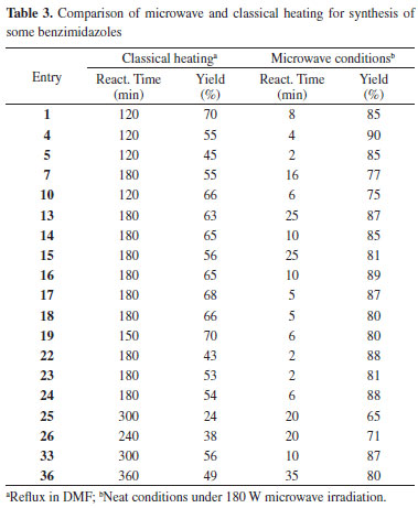 CONCLUSIONS A simple and efficient methodology for the synthesis of 2-substituted benzimidazoles and bis-benzimidazoles was developed. The reaction times were reduced from hours to minutes by our MW-assisted method. Benzimidazoles with different kinds of derivatives were easily synthesized in good yields under neat conditions with an easy purification procedure.