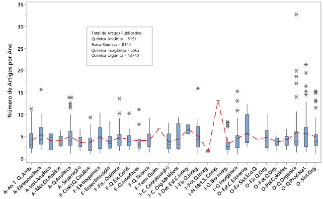 Na apreciação do fator de impacto dos artigos publicados por subárea, referentes às Tabelas de pontuação do JCR 2011, verificou-se que as maiores médias de publicação da Química foram nas faixas com valores de 1<FI<4. Na faixa de 3<FI<4 a Química Analítica foi a que mais publicou, com média de 12,1 artigos/bolsista, seguida da Físico-Química, com média de 8,8 artigos/bolsista, dentre as Especialidades dessas subáreas, as que mais publicaram, nesta faixa de FI, foram a Eletroanalítica com média de 16,1 artigos/bolsista e a Termodinâmica Química com média de 12 artigos/bolsista. Na faixa de FI<3, a Química Orgânica foi a subárea que mais publicou. A Especialidade da Química Orgânica que mais publicou na faixa de 2<FI<3 foi a Evolução, Sistemática e Ecologia Química com média de 19 artigos/bolsista. Na faixa de 1<FI<2, a Estrutura, Conformação e Estereoquímica foi a Especialidade que mais publicou com média 20,2 artigos/bolsista. Na faixa 0,5<FI<1, a Química de Produtos Naturais tinha mais publicações, com média de 11,4 artigos/bolsista e na faixa de 0<FI<0,5 a Especialidade que mais publicou foi a Estrutura, Conformação e Estereoquímica com média de 10,6 artigos/bolsista. Com relação aos artigos publicados em periódicos cujo FI=0, a Química Analítica era a subárea com mais publicações por pesquisador, sendo que a Separação era a Especialidade da Química Analítica que mais publicou artigos em periódico de FI=0, com média de 7,2 artigos/bolsista. Já nas revistas de maior fator de impacto, ou seja, de FI>4, a Química publicou pouco em comparação às demais faixas de fator de impacto. A Química Inorgânica foi a subárea com maior média de publicação em periódicos de FI>6 e a Especialidade que mais publicou nestes periódicos foi a Não-Metais e Seus Compostos com média de 3 artigos/bolsista. A Físico-Química foi a subárea que mais publicou na faixa de 5<FI<6, com 1,2 artigos/bolsista e a Especialidade com maior média de publicação foi a "Especialidade"-Físico-Química com 1,8 artigos/bolsista. Na faixa 4<FI<5, as subáreas que mais publicaram foram a Química Analítica e a Físico-Química e as Especialidades mais produtivas foram, respectivamente, a Separação com média 5,2 artigos/bolsista e a Termodinâmica Química e a Eletroquímica, essas últimas com média de 7 artigos/bolsista. Artigos publicados por ano nas Especialidades da Química Na análise da produtividade científica dos bolsistas PQ da Química, no quesito número de artigos por ano, escolheu-se uma apreciação mais focada na mediana, por esta ser uma medida robusta, insensível a valores extremos (outliers) e, por isso, expressar melhor o comportamento produtivo da maioria dos bolsistas. Na Figura 2 são apresentados os boxplots referentes ao número de artigos publicados por ano, no período de 10 anos, de acordo com a Especialidade da Química. Os dados apresentam a mediana, o intervalo interquartil (IQ), os outliers e a linha de conexão dos valores das médias.