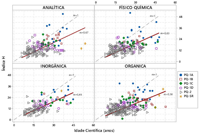 Figura 5. Índice H dos bolsistas por nível em cada subárea da Química com o avanço da Idade Científica. A linha tracejada refere-se ao índice m e a linha contínua refere-se à reta de regressão. Os valores de Índice H foram calculados a partir da base ISI Web of Knowledge pelos próprios pesquisadores e informados em seus currículos Lattes