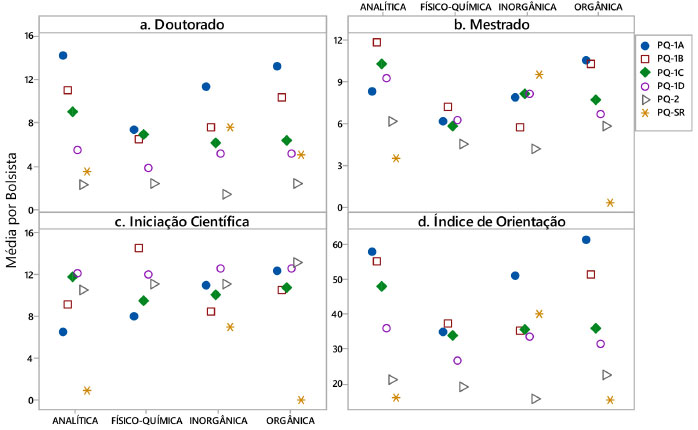 Figura 6. Formação de recursos humanos, sob orientação dos bolsistas PQ, por categoria de bolsa e nas subáreas: A. Orientação de Doutorado; B.Orientação de Mestrado; C. Orientação de Iniciação Científica; D. Índice de Orientação(IO). O IO se refere à equação do cálculo determinado nos critérios de julgamento de bolsa PQ estabelecidos pelo Comitê Assessor de Química no triênio 2012-201410