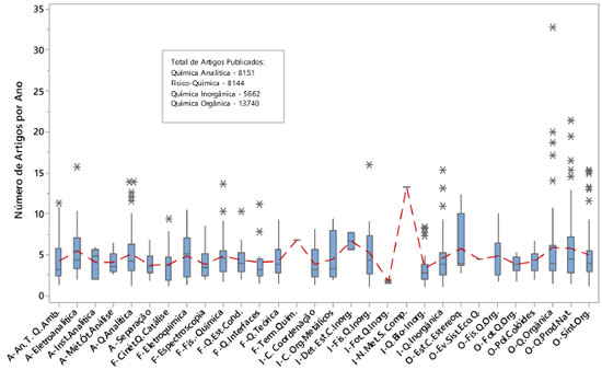Figura 2. Número de artigos publicados por ano, referente ao período de 2003 a março de 2013, em cada Especialidade da Química. Os boxplots contém a informaçao da mediana, intervalo interquartil, outliers (asteriscos). A linha tracejada é a conexao das médias de cada Especialidade da Química. Antecedendo o nome da Especialidade estao as siglas das subáreas: A (Química Analítica), F (Físico-Química), I (Química Inorgânica) e O (Química Orgânica)