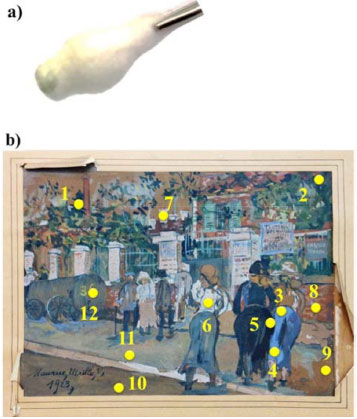 ![]() Figura 2. Haste de algodão usada para coleta de fragmentos pigmentados da obra (a) e fotografia da obra indicando as regiões de onde foram feitas análises por XRF (b). Os números 1 e 2 em (b) correspondem a regiões de cor verde; 3 e 4 a azul; 8, 9 e 10 a marrom; 5 a preta; 11 a bege; e 12 a amarela