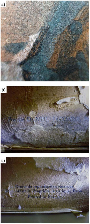 ![]() Figura 3. Fotografia com luz em ângulo rasante de parte da obra (a) e fotografia da região sob o passé-par-tout evidenciando a inscrição Daniel Jacomet (b e c)