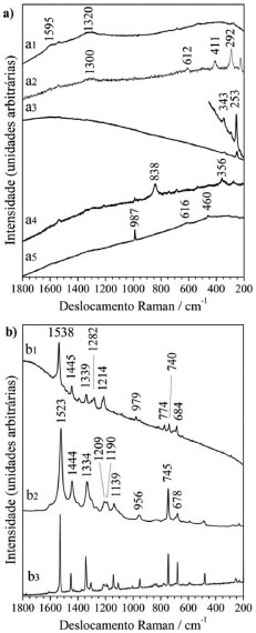 ![]() Figura 4. Espectros Raman dos pigmentos inorgânicos (a) e orgânicos (b) identificados na obra, sendo que a1 corresponde ao pigmento preto, a2 e a3 ao vermelho e marrom (respectivamente), a4 ao amarelo e a5 ao branco; b1 corresponde ao pigmento verde, b2 ao azul e b3 é o espectro de ftalocianina de cobre(II)