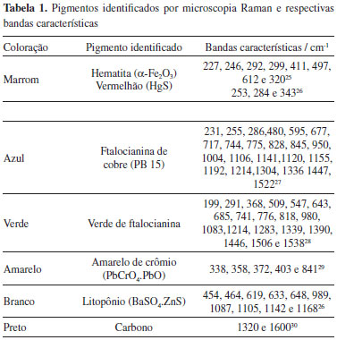 CONCLUSÕES Os resultados aqui reportados confirmam a capacidade da microscopia Raman e XRF, técnicas espectroscópicas não destrutivas (que podem ser invasivas ou não, dependendo do procedimento adotado), em caracterizar componentes de obras de arte. Como discutido na Introdução, a identificação de pigmentos tem sido empregada na datação de obras de arte, uma vez que levantamentos históricos mostram que há períodos claramente conhecidos de início e descontinuação do uso de pigmentos e corantes, seja devido à data de sua comercialização, seja devido à data de sua substituição por outras substâncias mais baratas, abundantes ou simplesmente menos tóxicas.32 No caso da ftalocianina de cobre e do verde de ftalocianina, sua comercialização iniciou-se em 1937 e 1939, respectivamente,32 e não eram, portanto, disponíveis em 1923, quando a obra original foi pintada, mas já estavam no mercado na época provável em que a reprodução aqui estudada foi feita - entre o final das décadas de 1940 e 1950 - período que compreende o final da Segunda Guerra Mundial (1945) e a separação das Faculdades de Farmácia e Odontologia da USP (1962), à qual a obra originalmente pertencia. Os pigmentos identificados na obra investigada (hematita, vermelhão, cromato de chumbo, ftalocianina de cobre, verde de ftalocianina, carbono amorfo e sulfato de bário) são compatíveis com aqueles historicamente esperados no uso da técnica de pochoir e as informações obtidas por inspeção com luz em ângulo rasante permitiram concluir que o quadro analisado foi produzido por essa técnica, a qual combinada com o uso de stensils, caracterizava o Procedimento Jacomet, desenvolvido por Daniel Jacomet em Paris na década de 1920. Esses resultados descartaram, portanto, a possibilidade da obra se tratar de uma reprodução moderna sem valor agregado. A caracterização molecular conduzida por microscopia Raman permitiu também evidenciar a complexidade e o cuidado para a obtenção de melhores resultados das reproduções feitas pelo procedimento Jacomet. No caso das áreas em marrom, por exemplo, hematita e vermelhão foram empregados para a obtenção da tonalidade que melhor reproduzisse a obra original. De um ponto de vista mais geral, o estudo aqui reportado evidencia que a questão do gerenciamento de bens culturais em instituições públicas é complexa, principalmente quando se trata de bens móveis e precisa ser abordada de forma incisiva e urgente em todas as instâncias. Pinturas e demais produções gráficas talvez sejam os mais relevantes casos do ponto de vista de instituições públicas: a alteração periódica dos dirigentes e a ausência de uma catalogação e patrimonialização adequadas, assim como de um inventário (instrumento constitucional de proteção ao patrimônio cultural) e de gerenciamento desse patrimônio, faz com que a médio prazo as informações sobre os bens institucionais se percam, assim como, frequentemente, o próprio bem cultural. Longe de ser um problema localizado a instituições governamentais, como repartições públicas, escolas, hospitais etc., esse problema estende-se também a museus nos quais o gerenciamento patrimonial não é feito de forma adequada, afetando não somente instituições no Brasil, mas também do exterior.