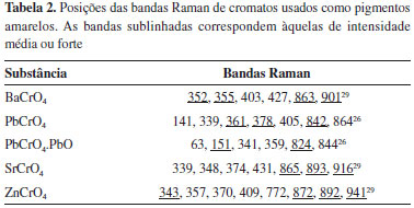 Pigmentos orgânicos e inorgânicos foram identificados por microscopia Raman e, como será visto adiante, apenas os inorgânicos são compatíveis com a data que aparece no quadro (1923). Os pigmentos inorgânicos identificados foram: (i) hematita (α-Fe2O3, com bandas Raman observadas em 227, 292, 411, 612 e 1300 cm-1), um pigmento vermelho largamente utilizado desde tempos pré-históricos, quando era empregado em pinturas rupestres; (ii) barita (BaSO4), um pigmento branco com bandas Raman observadas em 451, 460, 616 e 987 cm-1, e que começou a ser usado em pinturas provavelmente no século XVII, sendo disponível sinteticamente na França em meados do século XIX;21 esse pigmento, quando sintético, não é recomendado para pintura a óleo, mas sim para aquarelas e afrescos, que são casos similares àquele estudado neste trabalho;21 (iii) amarelo de crômio (PbCrO4), um pigmento sintético, inicialmente produzido em 187929,31 e com principais bandas Raman observadas em 356 e 838 cm-1; (iv) carbono amorfo, um pigmento natural com bandas Raman em 1320 e 1595 cm-1 e usado desde a pré-história; e (v) vermelhão (HgS), um pigmento vermelho usado na Europa a partir do século VIII, com principais bandas Raman observadas em 253 e 343 cm-1.21 Especificamente para o pigmento amarelo de crômio, apesar de existirem outros cromatos usados como pigmentos, como o amarelo de Bário (BaCrO4), amarelo de estrôncio (SrCrO4) e amarelo de zinco (ZnCrO4), as posições das bandas no espectro Raman não são as mesmas (Tabela 2), permitindo sua diferenciação e identificação inequívoca.