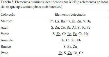 Não foram detectados pigmentos inorgânicos de coloração azul e verde. Nas regiões com pigmentação azul os espectros Raman apresentaram bandas em 678, 745, 956, 1139, 1190, 1209, 1334, 1444 e 1523 cm-1 características de ftalocianina de cobre (C32H16CuN8, Tabela 1). No caso do pigmento verde as bandas foram observadas em 684, 740, 774, 979, 1214, 1282, 1339, 1389, 1445 e 1538 cm-1 indicando a presença de verde de ftalocianina (C32Cl16CuN8, Tabela 1). As pequenas (e aceitáveis) discrepâncias nos valores de posição de banda quando os resultados experimentais são comparados com os padrões podem ser devidas às diferentes fases cristalinas de ftalocianina e a maior largura de banda pode advir de menor cristalinidade do pigmento. A primeira referência à síntese de ftalocianinas data de 1907, sendo que o uso comercial como pigmento em arte da ftalocianina de cobre, PB15, data de 1937 e o de verde de ftalocianina, PG7, de 1939.32 Considerando a tonalidade das áreas pigmentadas em verde, poder-se-ia a princípio considerar a possibilidade da presença de verde de crômio (Cr2O3), principalmente pela detecção de crômio nas medidas de XRF como será discutido adiante. Esse pigmento não foi, entretanto, identificado, mas é importante lembrar que esse óxido não é um bom espalhador de luz e, além disso, as ftalocianinas identificadas tem seu espectro Raman intensificado pelo efeito Raman ressonante. Dessa forma, caso verde de crômio tenha sido usado, suas bandas seriam facilmente obscurecidas pelas bandas muito mais intensas das ftalocianinas. As análises por XRF levaram à identificação dos elementos químicos presentes nas áreas com diferentes pigmentações no quadro, porém, é importante destacar dois aspectos da análise realizada: (i) a área sondada em cada medida feita pelo equipamento usado tem cerca de 5 mm de diâmetro e o espectro obtido corresponde, portanto, à contribuição de todos os pigmentos usados nessa área e (ii) a radiação usada é bastante penetrante e capaz de interagir com substâncias presentes em camadas internas de tinta, ao contrário da microscopia Raman que é uma técnica de superfície. Os espectros de XRF estão disponíveis como material suplementar. Na Tabela 3 são apresentados os elementos químicos encontrados com a respectiva coloração da área estudada por XRF, sendo que para as análises dos espectros foram subtraídos os sinais referentes ao papel sobre o qual os pigmentos se encontravam.