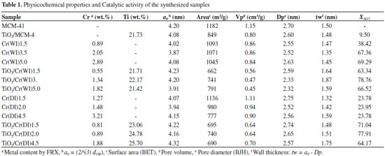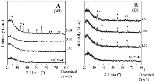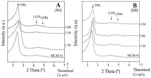 RESULTS AND DISCUSSION Figures 1 and 2 show the corresponding XRD patterns of the solids. The well-resolved peaks in the low angle region for all samples modified with Cr can be indexed to planes (100), (110) and (200) corresponding to a MCM-41 structure. The half-height width for the first peak would indicate that a higher structural order can be reached by DI, although, in all cases, this ordering decreases slightly with increasing Cr content. The Cr incorporation by WI would lead to a higher amount or size of metallic species (oxide clusters or nanoparticles) on the surface, which slightly affects the structural regularity. The high angle XRD patterns show the presence of chromia (2θ = 33, 36, 55.2, 63 and 65º) for all Cr contents in Cr(DI)x samples, and only for the higher Cr content in samples modified by WI. Nevertheless, a rough estimation of the oxide nanoparticle size showed values of ~48 nm for the impregnated sample and ~8 nm for samples synthesized by DI.33