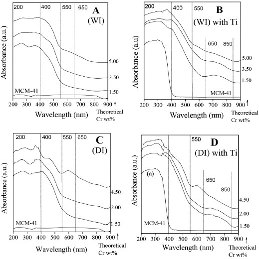 ![]() Figure 3. UV-Vis DR spectra of the samples synthesized by WI: A) modify with Cr, B) modified with Cr and Ti and samples synthesized by DI, C) modify with Cr, D) modified with Cr and Ti