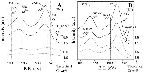 ![]() Figure 4. Cr2p core level photoelectron profile of: A) Samples synthesized by WI: (---) Cr(WI)x, (-) TiO2/Cr(WI)x and B) samples synthesized by DI: (---) Cr(DI)x, (-) TiO2/Cr(DI)x
