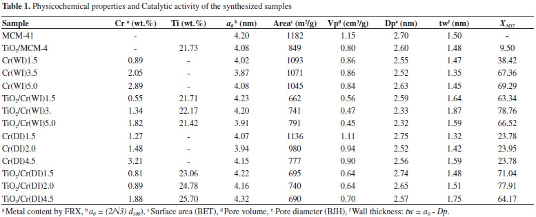 EXPERIMENTAL Synthesis The MCM-41 support was synthesized as previously reported (method B).28 The MCM-41 structures were modified with Cr by two different methods: WI samples were obtained as reported29-31 using several concentrations of Cr solutions, corresponding to theoretical Cr loadings of 1.50, 3.50 and 5.00 wt%. DI samples were obtained as reported (method B),28 were the Cr precursor was added to the initial gel (after the TEOS) in order to reach Si/Cr molar ratios of 60, 40 and 20 (theoretical Cr loadings of 1.5, 2.0 and 4.5 wt%, respectively). Then, these solids were submitted to desorption and calcination processes already described.28 All solids were modified by TiO2 according to30 in order to evaluate the influence of a second metal on their photoactivity. The catalysts were named: TiO2/Cr(DI)x or TiO2/Cr(WI)x, where DI or WI indicates the method of Cr incorporation used, x indicates the theoretical Cr content (wt%), and TiO2 is used in the case of the modification with Ti loading. Characterization The X-ray diffraction (XRD) patterns were recorded in a Philips PW 3830 diffractometer in 2θ ranges: 1.5-7º and 20-80º. The mean crystallite size of oxide phases was estimated using Scherrer formulae.32 UV-Vis diffuse reflectance spectra (UV-Vis DRS) were recorded using an Optronics OL 750-427 spectrometer between 200 and 900 nm. The Cr and Ti contents were determined by X-ray fluorescence (XRF) using an Innov-X System model ALPHA-4000. The specific area, the pore size distribution (Dp) and the total pore volume (Vp) were determined from N2 adsorption-desorption isotherms using a Micromeritics ASAP 2010. X-ray photoelectron spectra were collected using a Physical Electronics PHI 5700 spectrometer with non-monochromatic Mg Kα radiation (300 W, 15 kV, 1253.6 eV) for the analysis of photo-electronic signals of C 1s, O 1s, Si 2p and Cr 2p and multichannel detector. Spectra of powdered samples were recorded with the constant pass energy values at 29.35 eV, using a 720 µm diameter analysis area. During data processing of the XPS spectra, binding energy values were referenced to the C 1s peak (284.8 eV) from the adventitious contamination layer. Catalytic experiments Degradation experiments were performed in a photoreactor as was described.30,31,33 The suspension volume was 0.5 L and the catalyst concentrations was 1 g L-1. Bearing in mind that the AO7 concentrations from common industrial effluents are in the range of 0.35 and 35 mg L-1, in this work an AO7 concentration of 20 mg L-1 was chosen.34-38 This AO7 concentration corresponds to a pH of 5. After reaching the adsorption/desorption equilibrium in the dark, an initial sample was drawn to calculate the initial concentration (C0) and the experimental run was started. Each reaction corresponds to 5 h of irradiation. The AO7 concentration (C) was monitored at λ = 485 nm using a Jasco 7800 spectrophotometer. The AO7 degradation percentage was calculated as XAO7 = (C0 - C) 100 (C0)-1.