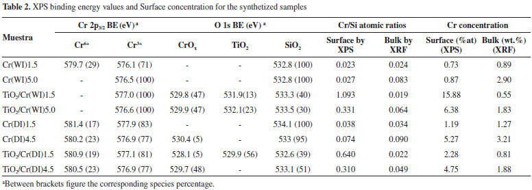 Nevertheless, the increase in the Cr3+ species amount when the Cr content increased (absorption above 400 nm) is clear. This fact is evident for the Cr(DI)4.5 sample due to the increase in the absorption at wavelengths higher than 550 nm and its intense green color. Moreover, a spectral response slightly shifted into red for the Cr(WI)5 sample could account for the greater particle size of the oxides present, in agreement with its XRD pattern. In order to enhance the absorption capability of the solids, they were modified with Ti. Then, in the UV-Vis DR spectra, it was possible to observe an increased absorption in the UV range due to the presence of titania. Moreover, the ability to absorb in the ranges of ~370-500 nm and ~650-850 nm was related to a Ti and Cr species heterojunction. This effect, however, is almost negligible for the sample impregnated with the higher Cr content.30,32 The XPS analysis has been employed to obtain information concerning the superficial composition of catalysts, the chemical state of the constituent elements and the chromium dispersion. The Si 2p binding energy value for all of the samples is around 103.4 eV, which is characteristic of MCM-41 silica. The binding energy values of the core level O 1s and Cr 2p signals are shown in Table 2. As it can be observed in this Table, the photoemission O1s for the Cr(WI)x and Cr(DI)x samples is mainly due to the contribution of oxygen from silica.