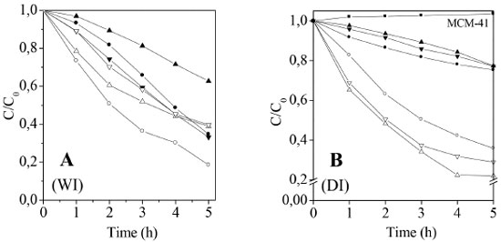 Centro de Investigación y Tecnología Química (CITeQ), UTN - CONICET, Maestro Marcelo López y Cruz Roja Argentina, Ciudad Universitaria, 5016, Córdoba, Argentina Recebido em 16/09/2015 *e-mail: geimer@scdt.frc.utn.edu.ar MCM-41 structures were synthesized and modified by direct (one-step) incorporation (DI) and wet impregnation (WI) methods. The solids were characterized by XRF, XRD, N2 adsorption and UV-Vis DR, and catalytically evaluated in the Acid Orange 7 (AO7) degradation under visible light. Significant influence of the presence, dispersion and location of the different Cr species on photoactivity was evident. Both synthesis methods allowed greater dispersion of the photoactive Cr species for lower metal content, enhancing efficiency for dye degradation. More specifically, after Ti loading in samples synthesized by DI, a notable AO7 degradation increase was associated with the strong heterojunction between Ti and Cr6+ species, which wereare highly dispersed due to the DI method used. INTRODUCTION In the 90's, M41S transition metal derivatives were extensively studied. In this regard, a variety of metal ions can be introduced in the sieves by different methods to be used as environmentally compatible catalysts for several applications. Particularly, an interesting aim in the last decade was to optimize the use of solar radiation as a clean energy resource for the development of new sustainable pollution abatement technologies. It is known that heterogeneous photocatalytic processes involving semiconductors excitable by solar light have been the focus of numerous investigations.1-5 In this sense, the use of different supports for the semiconductor dispersion, such as MCM-41, has emerged as a good strategy to develop new photocatalytic systems.6-17 Two methods are usually employed to modify mesoporous molecular sieves with transition metals: direct incorporation (in one step) (DI)18-22 and wet impregnation (WI).23-27 The introduction of metal ions into the framework is often favored by the DI of the metal source in the synthesis gel. Meanwhile, WI generally allows reaching a larger amount of metallic species (metallic oxides) loaded on the surface. Therefore, these methods lead to different coordination environments of the metal in various metallic species, which gives rise to important differences in the physicochemical properties of the final solids. Thus, these physicochemical properties may be controlled by incorporating metal ions into the framework or loading distinct metallic species such as oxides onto their surface. In this work, we present a comparison between the WI and DI methods to synthesize MCM-41 structures modified with Cr. In addition, these solids were also modified with a second metal, Ti. After Ti loading, the physicochemical properties of both kinds of materials and their photoactivity in Acid Orange 7 (AO7) degradation were evaluated.