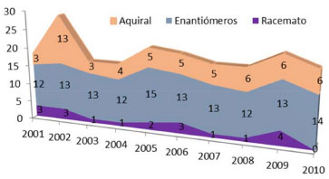 ![]() Figura 3. Distribuição anual dos fármacos aprovados no período 2001-2010, adaptado da ref. 41 (*Incluindo misturas diastereoisoméricas)