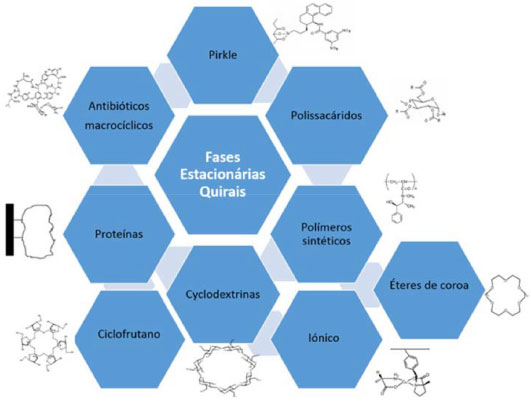 Há muitos tipos de colunas quirais comerciais, recentemente revistas na literatura.93,96-99 Na Figura 5 estão descritos os seletores quirais mais importantes.93,100,101 A escolha da FEQ baseia-se na literatura disponível e nas características gerais do seletor e do analito. Atualmente, FEQ derivadas de polissacarídeos, de antibióticos macrocíclicos e do tipo Pirkle (moléculas pequenas) são apontadas como as mais úteis e amplamente usadas (Figura 5). Muitos autores iniciam o desafio de tentativa-erro com FEQ derivadas de polissacarídeos, de antibióticos macrocíclicos ou tipo Pirkle (Whelk-O1), porque são versáteis e adequadas a todos os modos de eluição.100,102-110 A tendência de separação no modo normal mudou ao longo da última década para modo reverso, polar orgânico e polar iônico,105,106,108-110 com a vantagem de ser compatível com LC-MS/MS. A separação no modo HILIC (do inglês, Hydrophilic Interaction Liquid Chromatography) pode ser utilizada em FEQ derivadas de polissacarídeos, que são indicadas para modo reverso e HILIC ao mesmo tempo, dependendo do analito e das condições de separação.94