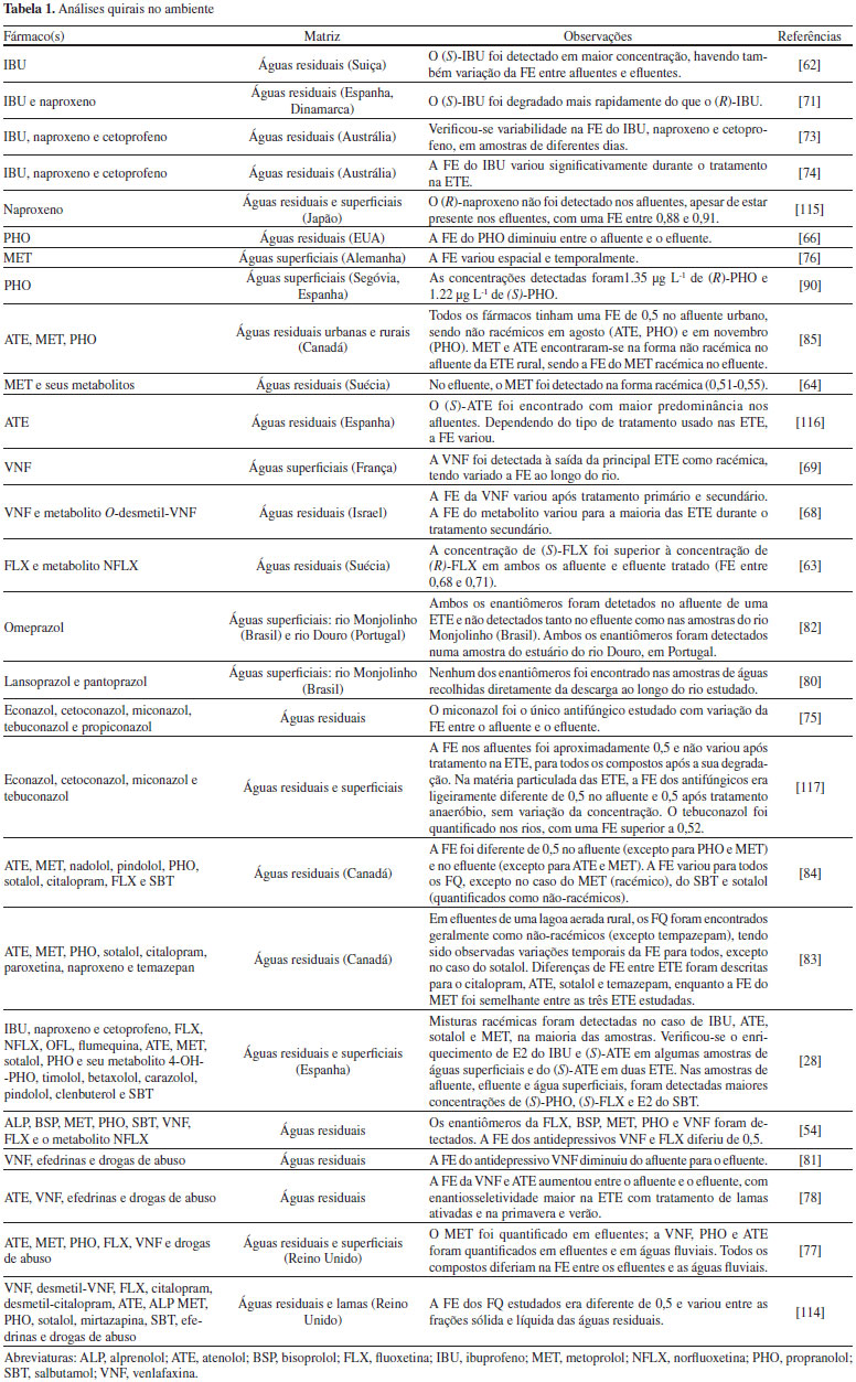 | Fármacos quirais em diferentes matrizes ambientais: ocorrência, remoção e toxicidade Chiral pharmaceuticals in diverse environmental matrices: occurrence, removal and toxicity |