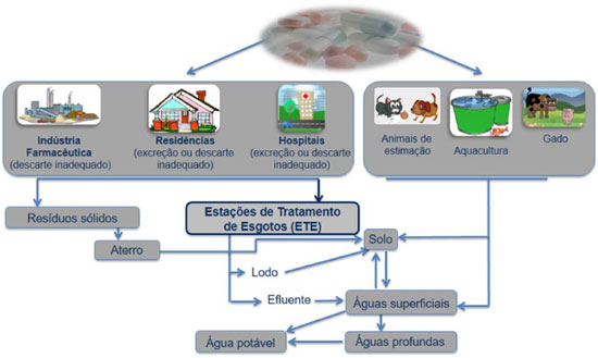 Em países desenvolvidos, a indústria farmacêutica não representa a principal fonte de contaminação ambiental por estas substâncias mas em alguns países asiáticos há registos de níveis elevados de fármacos em efluentes industriais, onde não existem normas restritivas para o descarte destes compostos no ambiente.13 Um estudo sobre a contaminação de fármacos pela indústria farmacêutica no Brasil revelou que os tratamentos utilizados em duas indústrias farmacêuticas não eram eficientes resíduos de antibióticos e seus produtos de degradação foram detectados nos efluentes destas indústrias.14 O descarte inadequado de medicamentos não utilizados ou fora do prazo de validade também representa uma via importante de entrada de fármacos no ambiente.15 Nestes casos, os fármacos são eliminados principalmente como moléculas não modificadas, uma vez que apenas sofrem as ações fracamente delatórias da luz e humidade, não tendo sido submetidos a qualquer processo metabólico no organismo (Figura 1). Quanto aos medicamentos usados em aquacultura, produção animal e no tratamento de animais de estimação (Figura 1), estes e/ou seus metabolitos são disseminados diretamente para a água, ou pelo escoamento ou lixiviação das excreções para o solo, ou indiretamente, pelo estrume usado em solos agrícolas.6,16 No entanto, a principal fonte de fármacos no ambiente é o consumo humano.12 A grande maioria dos medicamentos de uso humano e seus metabolitos16,17 são excretados e recolhidos para tratamento nas ETE municipais, por meio dos esgotos domésticos. Os efluentes hospitalares também têm uma grande contribuição para a presença de fármacos no meio ambiente (Figura 1), uma vez que estes efluentes são habitualmente descarregados em ETE municipais.18,19 As ETE são planeadas para remover uma grande parte da matéria poluente da água, contudo, não estão projetadas para remover completamente moléculas pequenas em baixas concentrações, como é o caso de fármacos e seus metabolitos.20 Além da fotodegradação e hidrólise, os fármacos nas ETE passam também por processos de adsorção e sofrem biodegradação, sendo esta última considerada como o processo de eliminação mais importante no tratamento de águas residuais.21 A implementação de tecnologias de tratamento avançado nas ETE poderá permitir o aumento da eficiência da degradação de fármacos ou mesmo da sua total mineralização.22,23