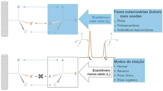 Figura 4. Representação da separação quiral, segundo a diferente afinidade entre os dois enantiômeros e o seletor quiral da FEQ