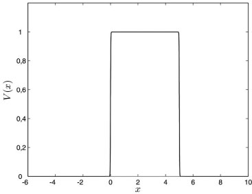 ![]() Figura 1. Aproximaçao para o potencial barreira retangular, α = 100, Vmax = 1 e L = 5